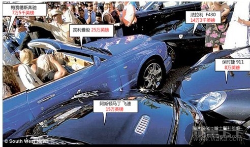 【蒙特卡洛豪车五连撞,总价70万英镑】一位大姐开着她的宾利,一下子撞上了一辆梅赛德斯、一辆法拉利、一辆保时捷和一辆阿斯顿马丁。五辆车加起来价值70万英镑(合736万人民币)。这场堪称世界最贵交通事故发生之后,数百名游客立刻掏出相机和手机拍照