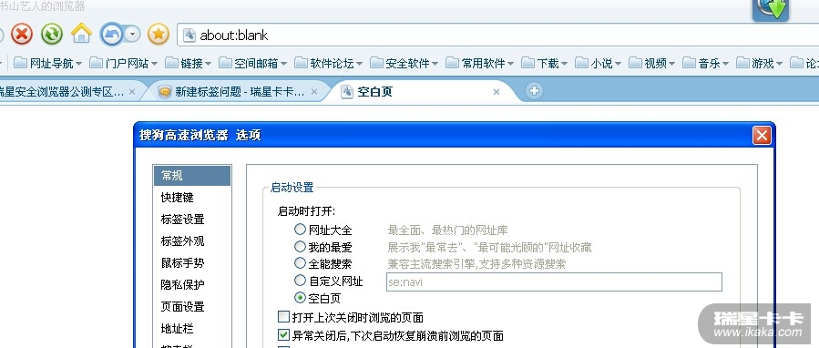 出现应用程序错误问题,建议修复瑞星安全浏览器,至于楼主所说的空白页问题,这个是瑞星为方便用户提供的标签页,在用户没有输入任何网址的情况下会出现,标签为用户经常使用的页面