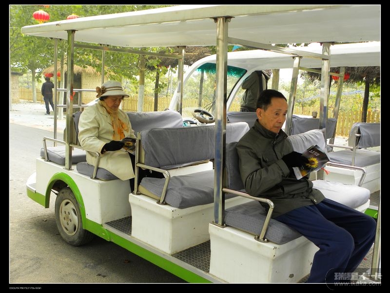 毕竟是上了年纪的人,不能再像年轻人那样奋勇争先,二位革命老人安静的坐在交通车里阅读大美田园发的手册