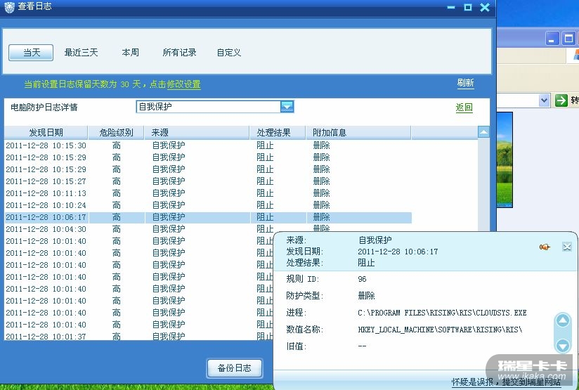 3.瑞星日志。日志上传方法:右键托盘处监控图标>>查看日志>>备份日志,将生成的db文件压缩跟帖上传