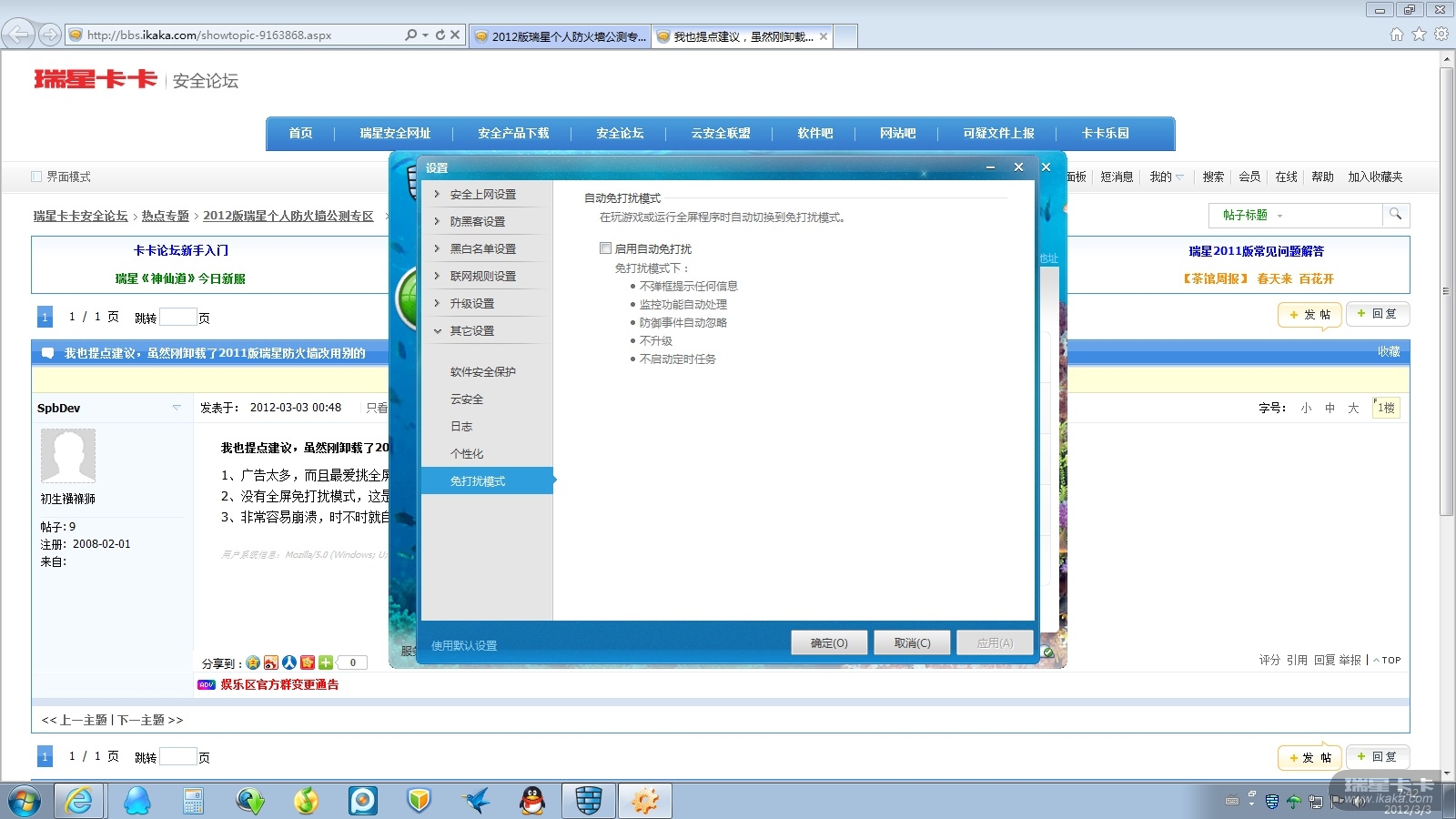 回复:我也提点建议,虽然刚卸载了2011版瑞星防火墙改用别的