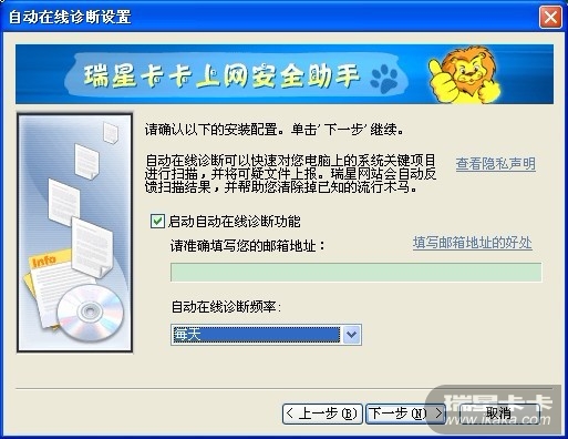 1.增加卡卡助手安装时有提示用户,自动在线诊断(这种提示是很好的,安全助手希望添加。但是希望改进邮箱地址的输入,假如用户默认邮箱是 杀毒,防火墙,全功能的输入邮箱,这样会缩短时间,不会耽误什么时间。)