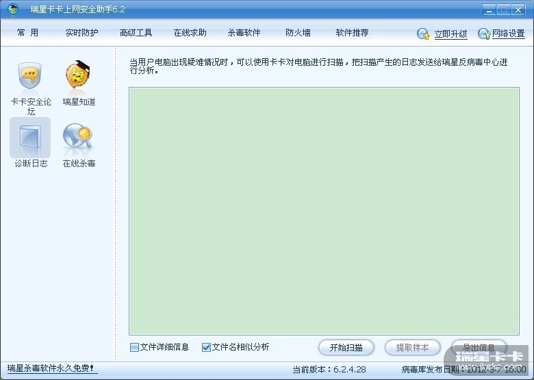 5.增加卡卡的诊断功能(只不过卡卡的诊断真的不好,希望安全助手能够加强,然后上传到瑞星安全论坛的”反病毒、反流氓软件讨论区“,还要上传文件诊所和云安全监测。。。。地址: