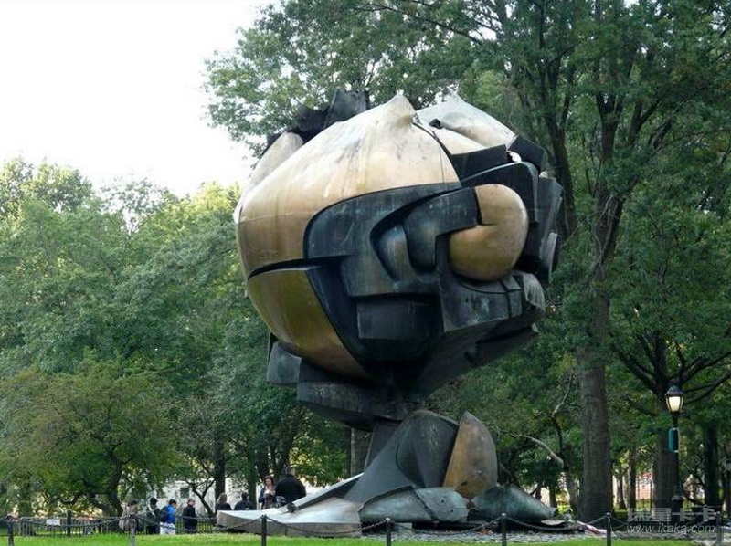 被撞毁的世贸大楼前的标志物,现暂时摆放在这个公园里,新楼建成后将移回原址