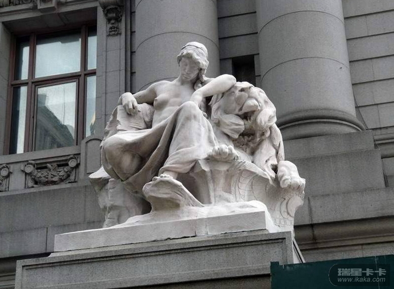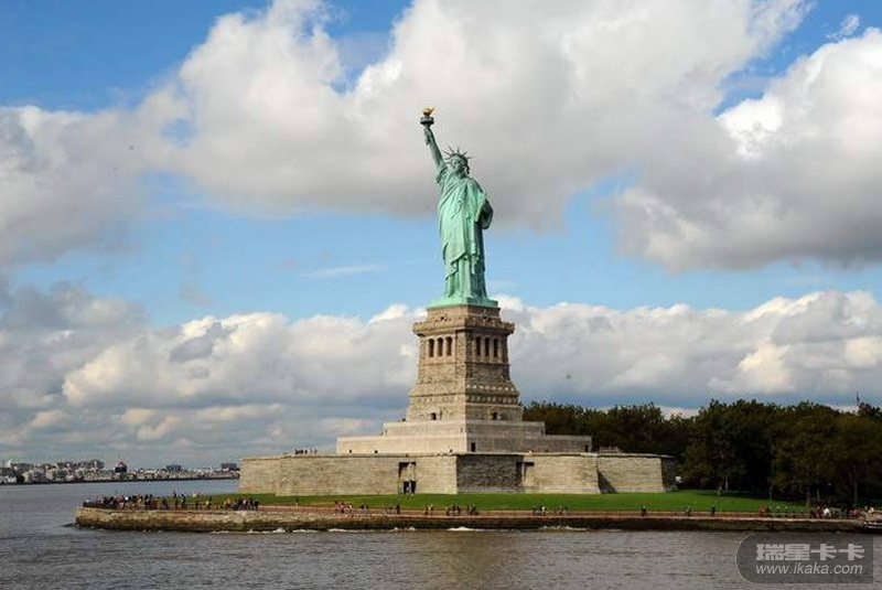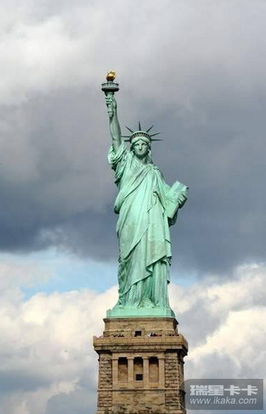 自由女神穿着古希腊风格的服装,右手高举象征自由的火炬,左手捧着刻有