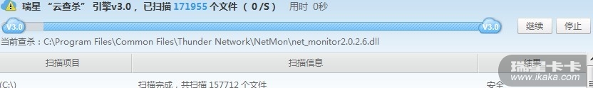 4.进度条bug见附图,具体情况是结束后(我估计还没有完全结束,这个助手不光是查木马,清理垃圾时也没有进度条,就结束时变个状态,不注意都不知道什么时候结束)点继续再点开始就出现这个了。另外进度条与查杀进度不同步,很快就到头了,是不是应该先确定文件总数再分配进度啊,不能按时间或文件个数,或者说让进度条一直循环也可以啊