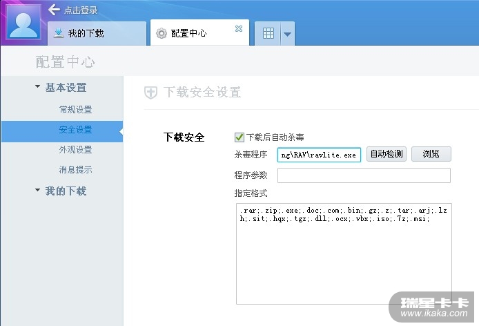 若希望调用瑞星的快捷查杀进度条(而非启动主程序)查毒,请在迅雷的相关设置中,手动指定杀毒程序为RavLite.exe,不要自动检测。以迅雷7为例,此项设置位于配置中心>>基本设置>>安全设置,勾选“下载后自动杀毒”,填入本机ravlite.exe所在路径即可(默认路径:C:\programfiles\Rising\RAV\ravlite.exe),如图:
