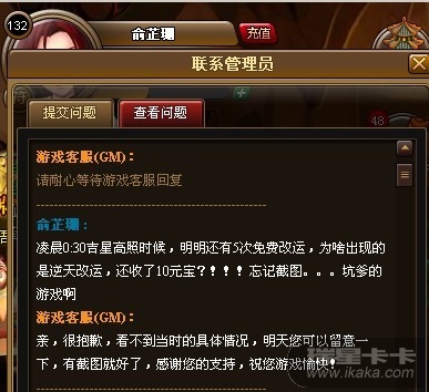 请将您的所在游戏区,游戏角色名以及此截图事件的具体时间告知一下, 我会马上进行数据追查!谢谢!