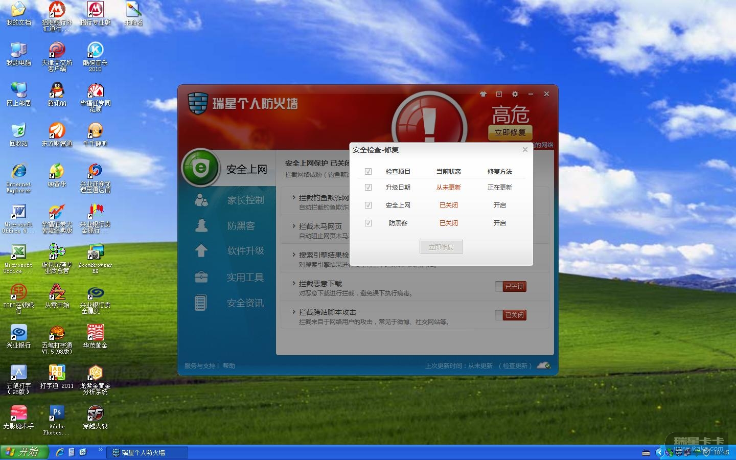 www.risng.com.cn下载最新版本安装包,重新安装一下,确定没有其他安全软件把瑞星优化了,安装瑞星的时候,相关驱动也都放过不能拦截。