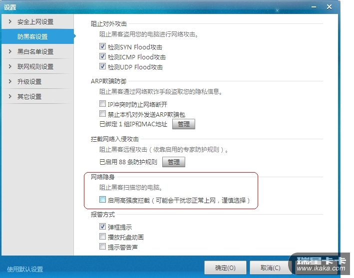 4.开启网络隐身时,设置中启用高强度拦截有没有勾选(如下图)?
