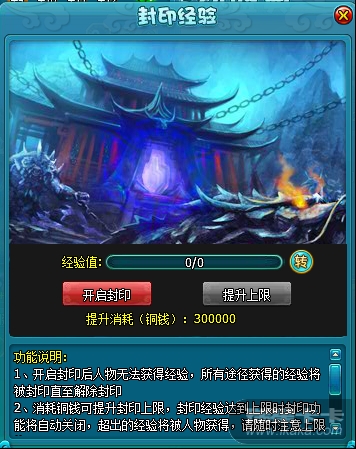 特别提醒:当获得的经验超出封印上限时,封印功能自动关闭,并且超出的那部分经验将被人物获得,所以广大玩家请随时留意上限情况,避免不必要的损失。