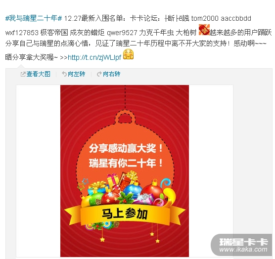 “二十年礼遇” #我与瑞星二十年# 最后一批中奖名单新鲜出炉: @白羊O @东冠英胡同 @一盆糨糊 @tovanora @王舒jasmine 马达加斯加的企鹅 昏晓 @_趙海銘 大将风度 @scarletye 请获奖的10名幸运用户速将姓名电话地址私信给小编!大家澎湃吧! 跟着卡卡有红包哦