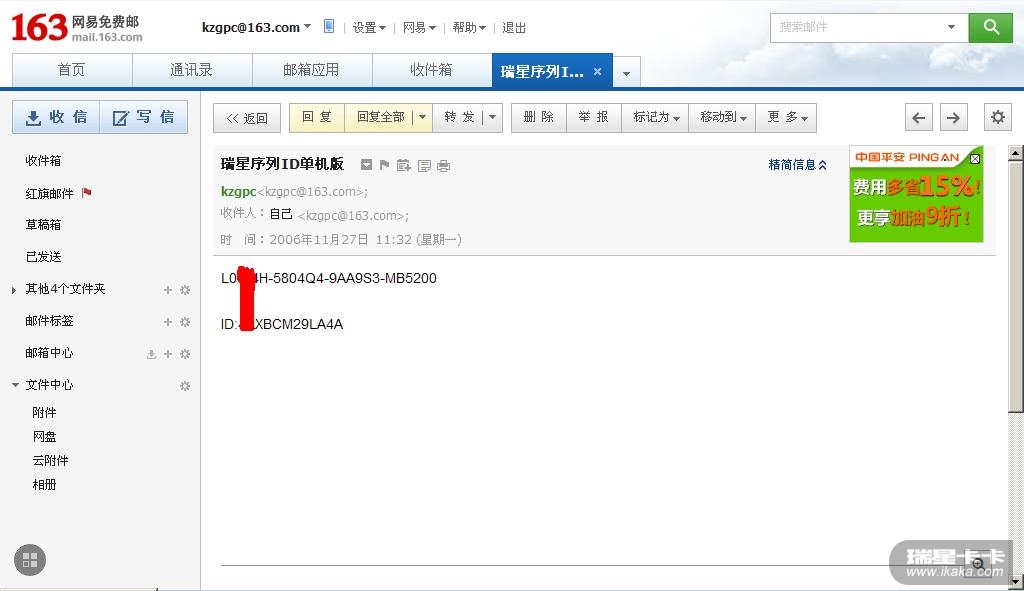 我是2003年在单位接触的瑞星,2005年单位开始用“瑞星中小企业版”统一管理着分布在各站的电脑,感觉不错,2006年单位领导买了单机版的瑞星产品,因为单位安装了监控,可以远程看到我在电脑上的操作,感觉不方便,于是我将领导的三个序列号抄下来[发到自己的电脑专门邮箱里(注:我将电脑有用的都发到自己邮箱里)],安装到我的电脑上,这是邮箱的截图,