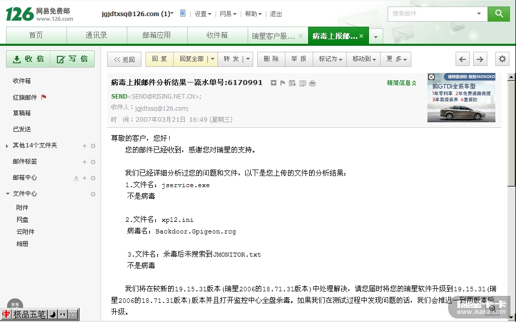 由于不在单位的“瑞星中小企业版”保护,同事家的孩子到我的机器上玩,结果中招了,于是在2007年3开始求助瑞星工程师,并得到了圆满解决。这个邮箱是单位的邮箱。