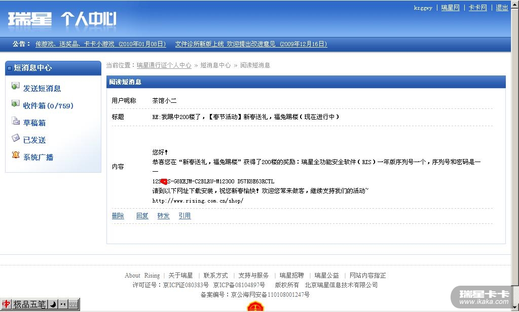 1、2011年2月参加“新春送礼,福兔踢楼”活动中,获得了200楼的奖励:瑞星全功能安全软件(RIS)一年版序列号一个