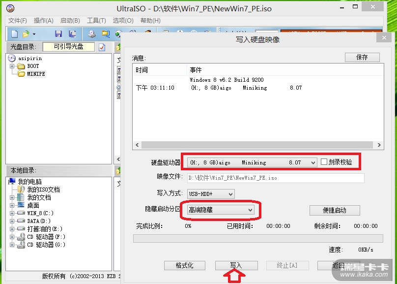 5、在“写入硬盘映像”界面选择“高端隐藏”,并核实“硬盘驱动器”确实是你要制作的可引导U盘。千万别稀里糊涂的写到电脑硬盘中哦!!然后。静静等待它写入操作完成。这PE 引导U盘就制作完了。就这么简单。