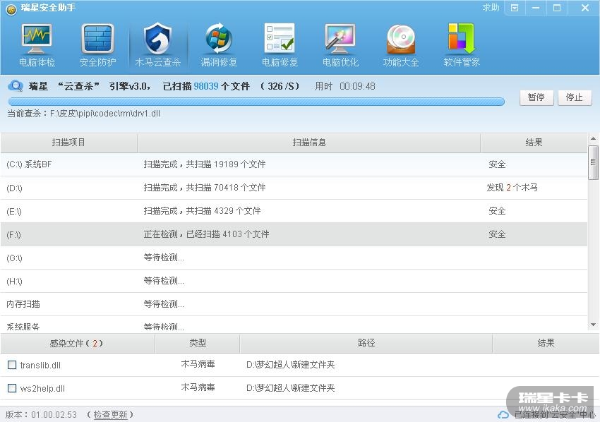 其实我就是用的是最近的瑞星杀毒软件~~~还有我也不知道病毒在哪里~~~只是好比我用360的时双击打开~~360说文件已经被病毒损坏~~无法的开~~我开游戏也是一样的提示~~~瑞星也只能查到感染文件~~打不出木马呀