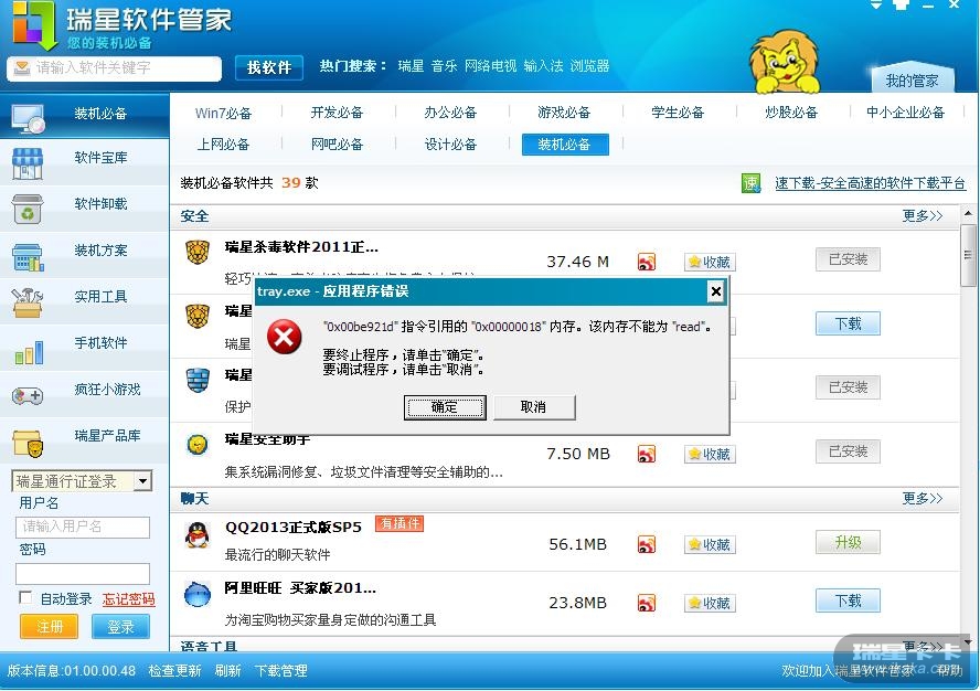回复: 在瑞星助手里软件管家打不开,单独下载了也安装不了程序