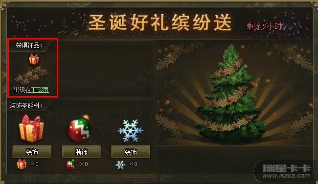 2. 圣诞树全部装满,可摇圣诞树获得圣诞大礼包,礼包内容包含:点券、高级丹书铁券、镔铁、免费幻影、至尊洗练次数、粮食。花费金币,可多摇多获!