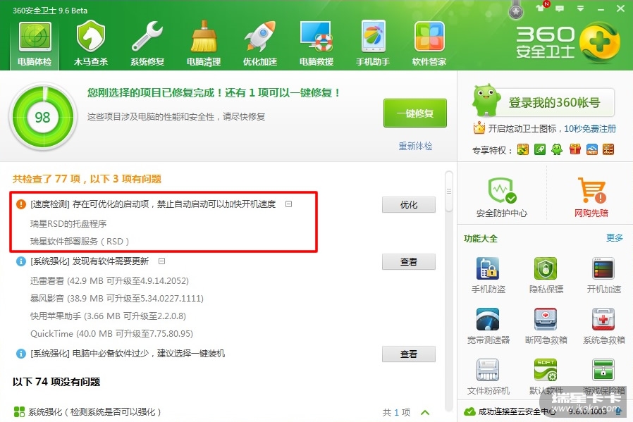 360不那么提示,就无法显示出它优美于其他家的软件的。