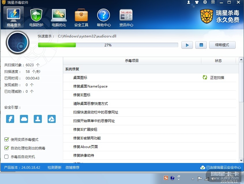 2、扫描结果显示不正常。(如:共扫描对象、用时、发现威胁)