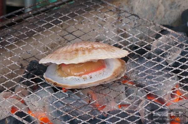 我点的烤扇贝(200日元/只),日本大妈正在加工中: