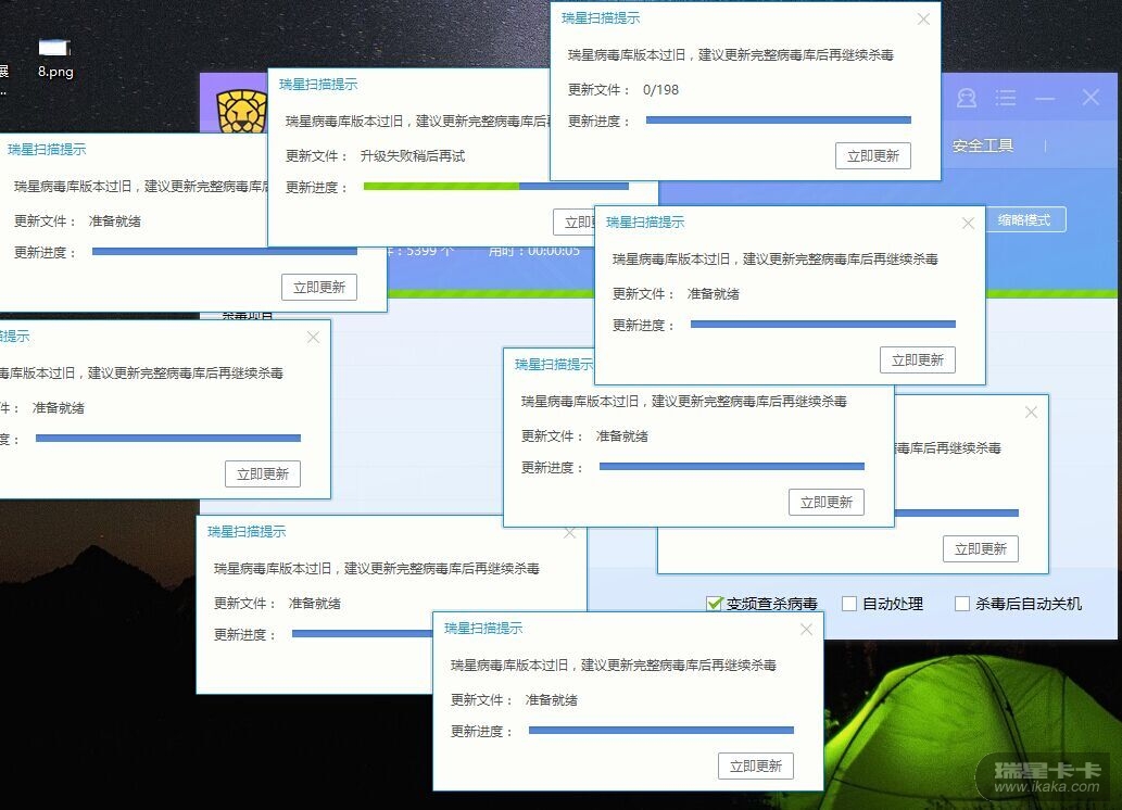 2、反复右键点击系统托盘区的“快速查杀”会不停弹出病毒库过旧,是否升级的提示,把第一个提示框关闭后,即进入快速查杀状态,但是其他提示窗口却无法关闭了,最后导致主程序报错。建议执行自定义查杀任务的时候,只允许一个升级提示实例运行。
