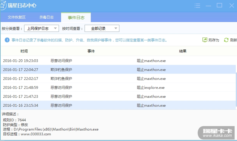 win7 64位下 使用杀软v17搭配防火墙v16 ,测试一些瑞星能在win732位系统下拦截的恶意网站,发现在64位系统下,均未拦截。但是很奇怪的是,点击v17日志中心,发现却是显示拦截掉了,可是并没有拦截成功啊,如图