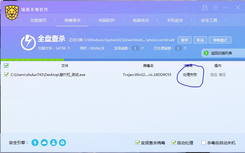 [疑似bug] win7-32 运行病毒后,处理失败了