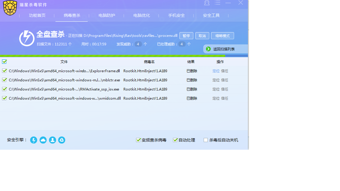 我的计算机最近发现病毒,用瑞星V17版本无法彻底删除病毒。现象如下:用瑞星软件杀毒,软件上显示病毒已清除,关机重启电脑用瑞星V17版本仍然可以查到病毒,再次杀毒还会出现类似问题。我的瑞星软件版本为:24.17.0083,病毒库版本:28.0530.0004。附件为隔离区带病毒文件,以及瑞星杀毒界面拷屏。