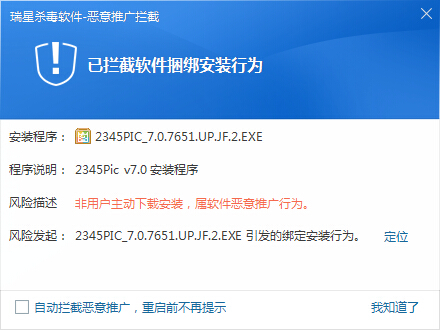 2、只拦截一次, 但是 后续 瑞星就没有再次弹窗 拦截了 ,但是 虽然 不显示 拦截ui, 但是 一直2345升级不正常,关闭瑞星拦截后,才能升级