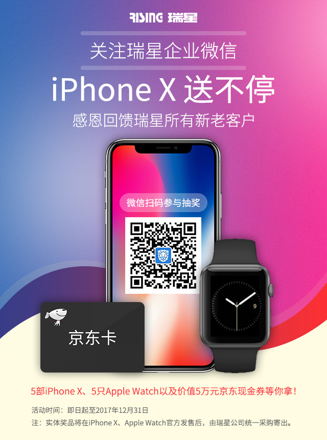 感恩回馈瑞星企业客户的一个活动,奖品是5部iphoneX、5只Apple Watch以及价值5万元的京东现金券