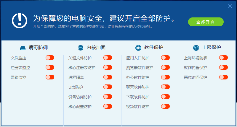 如图,瑞星的所有自我保护都被强制关闭了,该怎么办?
