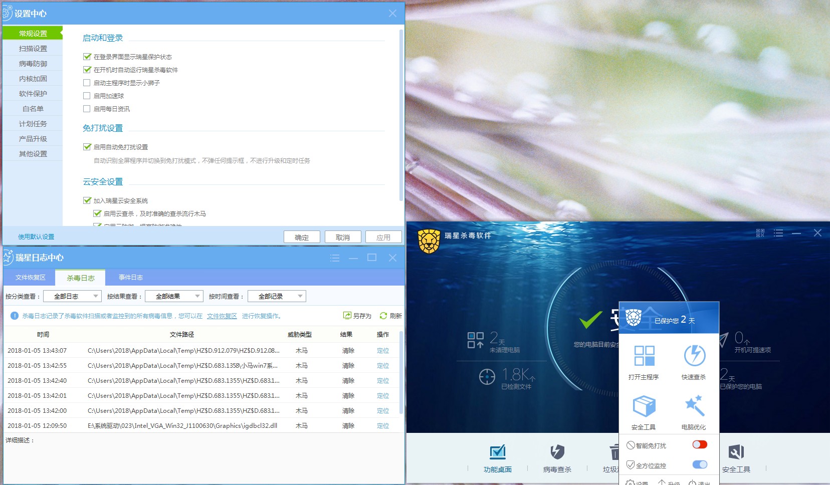 补充:瑞星既然有了新的气象【界面】,日志中心和设置中心以及右下角图标右键怎么还延用旧的颜色哈!