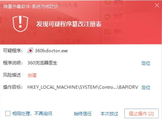 打开360极速浏览器出现的窗口,选择了“相同处理不再询问”之后似乎关机之前没法解除,再开机就又报。希望能有个更全面的黑白名单列表,能取消,也要能一直保持允许或阻止。