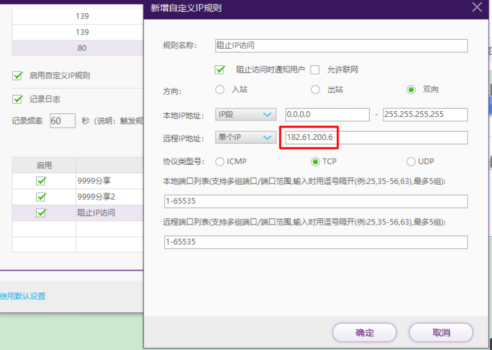 提几个想法:1.远程IP地址这里是单个IP,希望可以输入多个IP,不然一个IP一条规则,太麻烦了;2.TCP、ICMP、UDP这些希望能够同时选择,而且要不要考虑一些其他类型的协议?3.在拦截的时候记录一下访问的进程,这点其他IP规则也是。