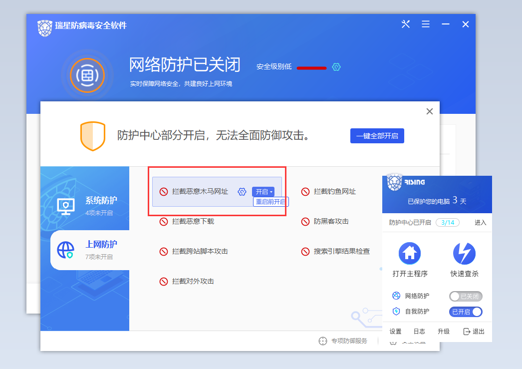 一是先点一下托盘区右键网络防护开关,把网络防护全部关掉,然后点击任意一个主界面网络防护的子项开关,全部子项防护都会被一次开启,而不是单独打开该子项防护。