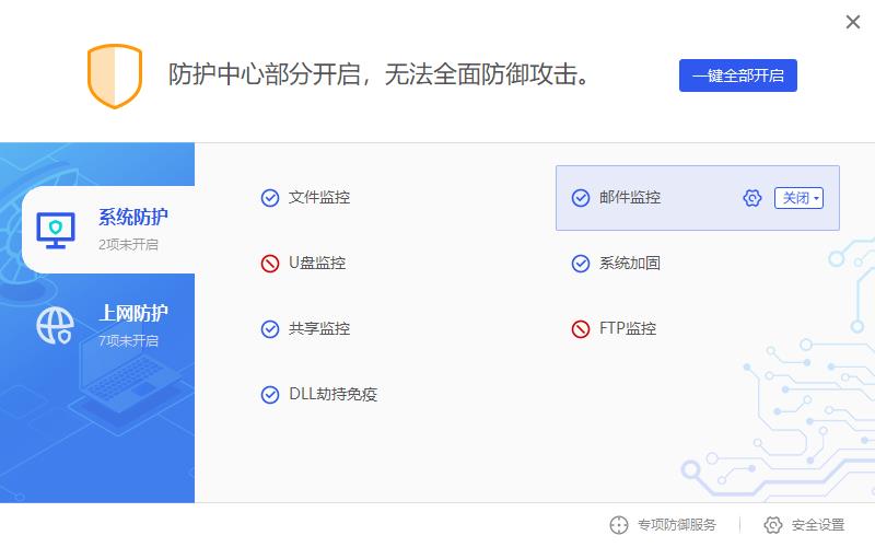 通过右下角的防护中心进入主界面,会发生防护显示与实际防护状态不统一。