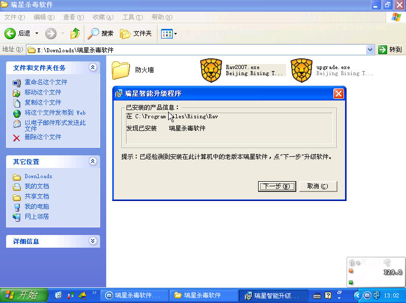 有时候卸载杀毒软件后,想重新安装,安装时瑞星提示发现已安装,点“下一步”升级。如图: