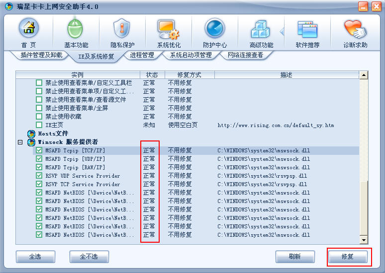 1.下载卡卡上网安全助手,安装上。打开卡卡/高级功能/IE及系统修复,把下