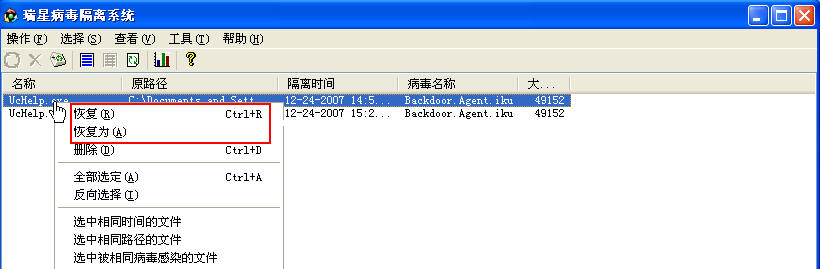 瑞星杀毒软件有一个病毒隔离系统,只要瑞星杀毒时删除掉的文件都可以在这里看到