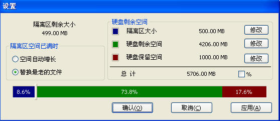 此外,病毒隔离系统的空间是自己可以进行设置的,点工具/设置空间,就能看到设置界面,根据自己需要设置空间的大小就可以了。如图: