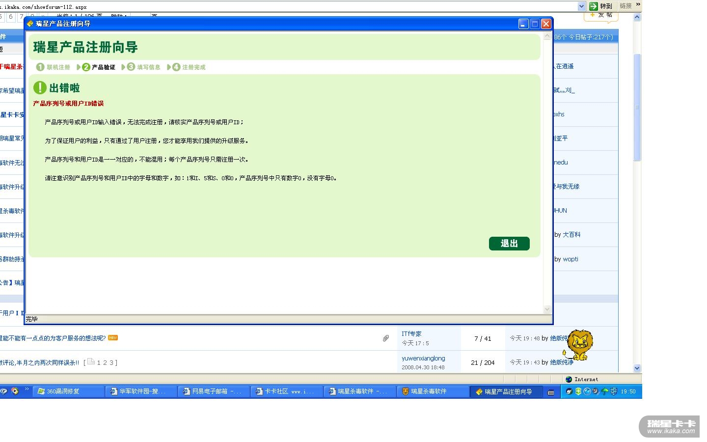 刚刚买的正版瑞星,防火墙能正常升级,杀毒软件点升级却提示:用户IP与序列号不匹配,如图,请问如何解决?