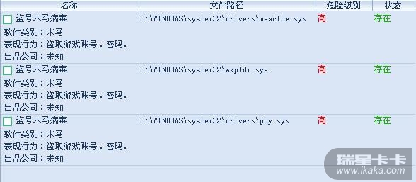 卡卡查出三个盗号木马!但瑞星扫不出!!