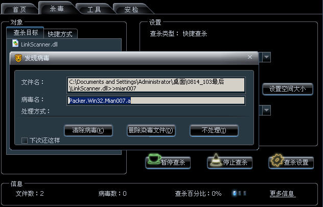 瑞星2008误报“畅游巡警奥运卫士版”的一个DLL文件(LinkScanner.dll)为packer.win32.Mian007.a。希望可以尽快解决!