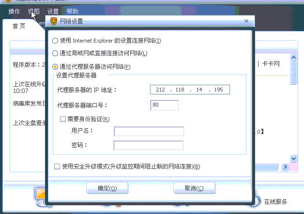 打开杀毒软件/设置/网络设置,选择第3项通过代理服务器访问网络,做如图设置: