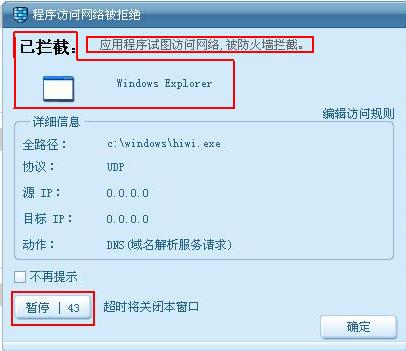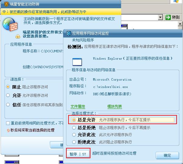 防火墙的第一项是“总是允许”而主动防御是“阻止”,我按惯了主动防御,差点就把防火墙的提示选“总是允许”了!建议调整一下位置。另外,暂停按钮有些突兀,和确定并排放,是不是会好看些呢?