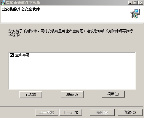 在杀毒软件的升级中,每次出现一个画面说:我安装了金山毒霸.实际我没安,但又删不掉.好烦好烦啊!我们的瑞星怎么还能有这样的问题出现呢?有失我们这样的大公司的声誉啊!!!请看这是升级中的画面:
