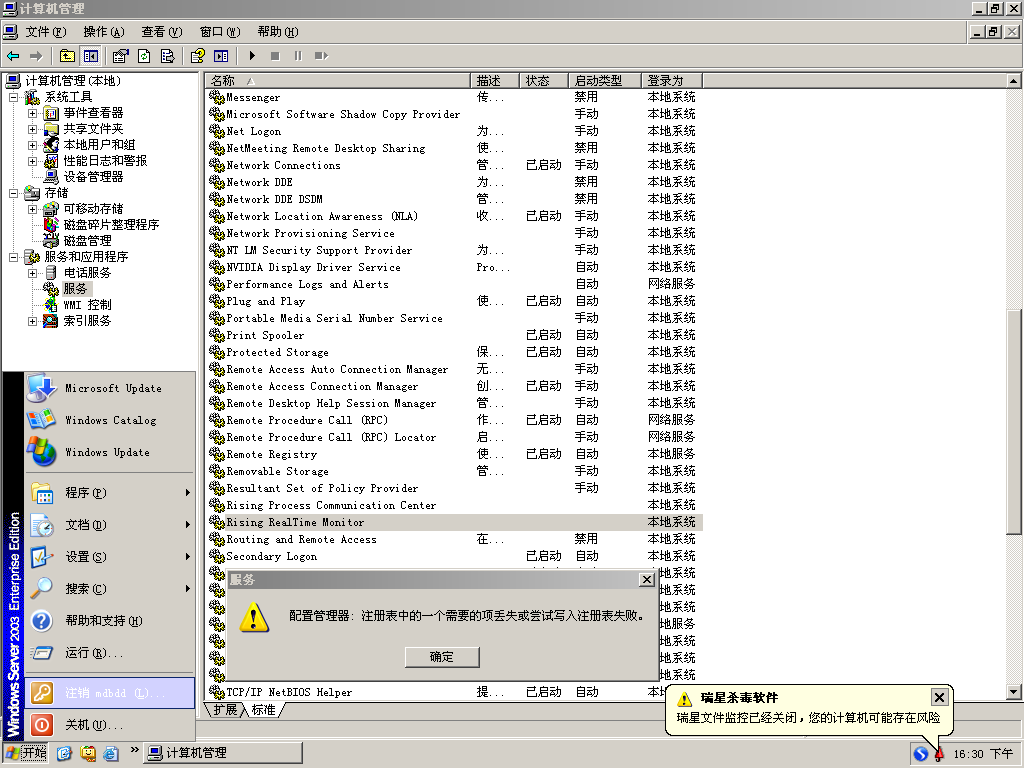楼主试一下,修复瑞星监控中心,方法如下:开始——程序——瑞星杀毒软件——添加删除组件——添加删除——瑞星监控中心,先把瑞星监控中心前面的对勾去掉点下一步直到完成,卸载瑞星监控中心,然后再按以上步骤把瑞星监控中心前的对号加上,重新安装。
