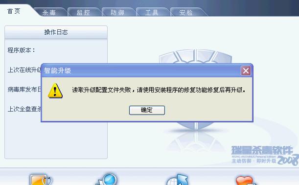 修复杀毒软件的方法:点开始/程序/瑞星杀毒软件/添加删除组件,选第二项修复,直到完成